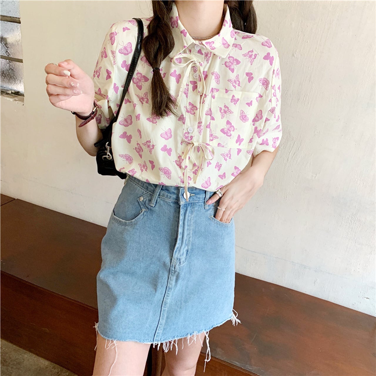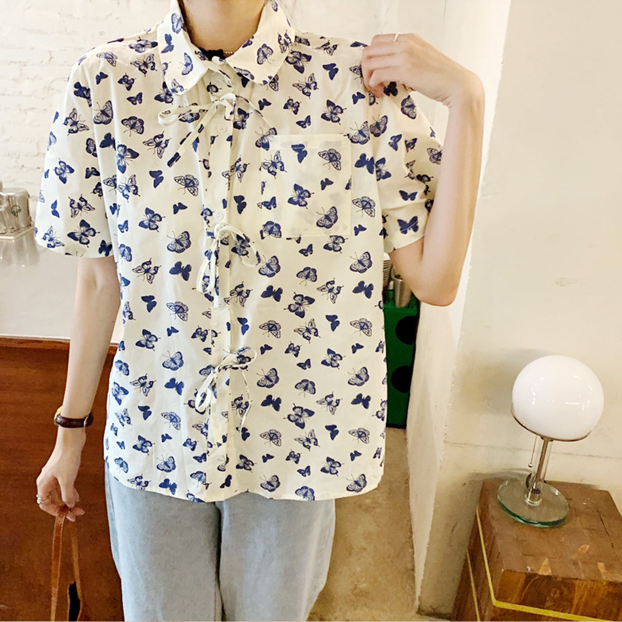 【REGIT】BUTTER FLY HALF SHIRT-PINK S/S 韓国服 トップス 半袖 シャツ ブラウス バターフライ 蝶々 リボン 夏 10代 20代 フェミニン カジュアル プチプラ 着回し 着映え ネット通販 TPB009