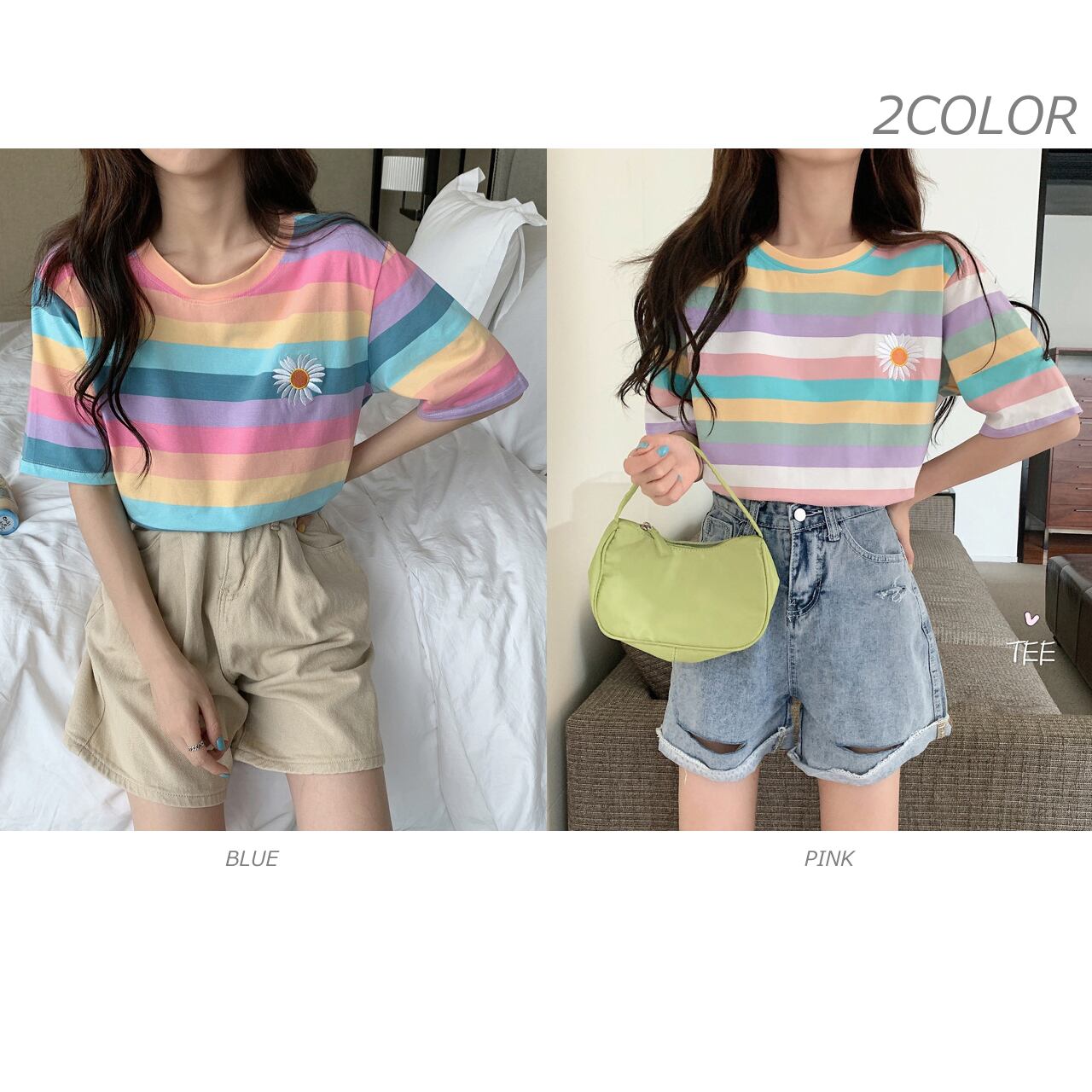 【REGIT】PASTEL RAINBOW HALF T-SHIRT-BLUE S/S 韓国服 トップス カットソー 半袖 Tシャツ 夏 レインボー ボーダー パステルカラー 10代 プチプラ 着回し 着映え ネット通販 TPT055