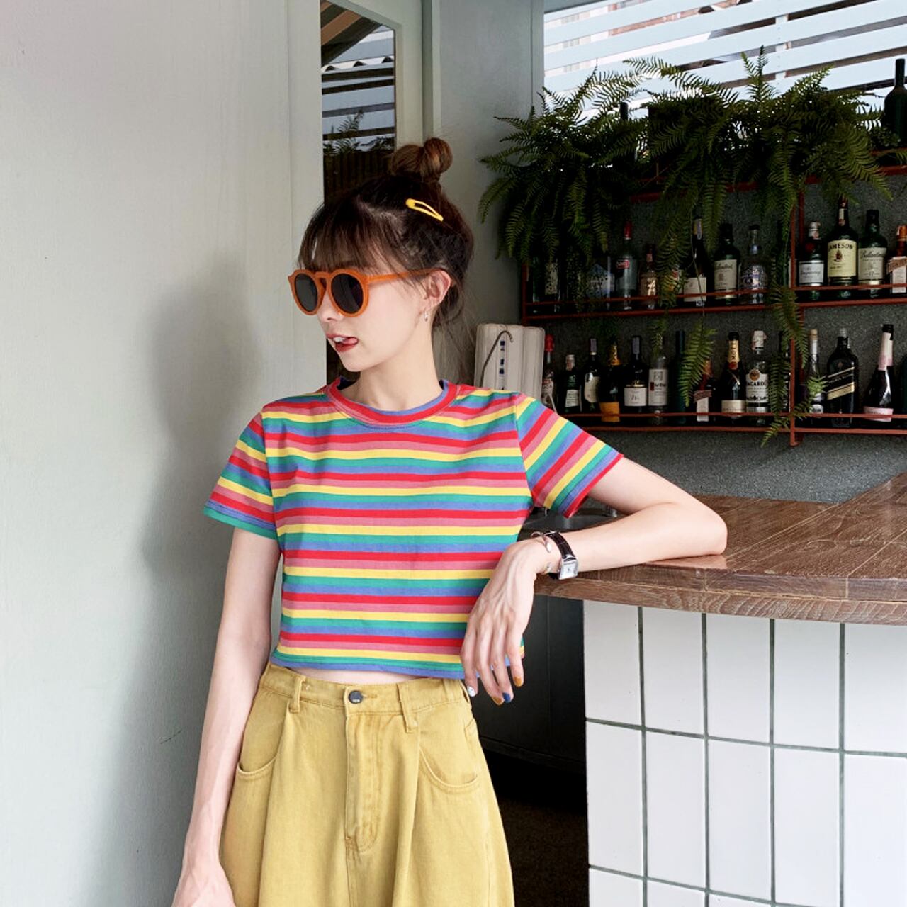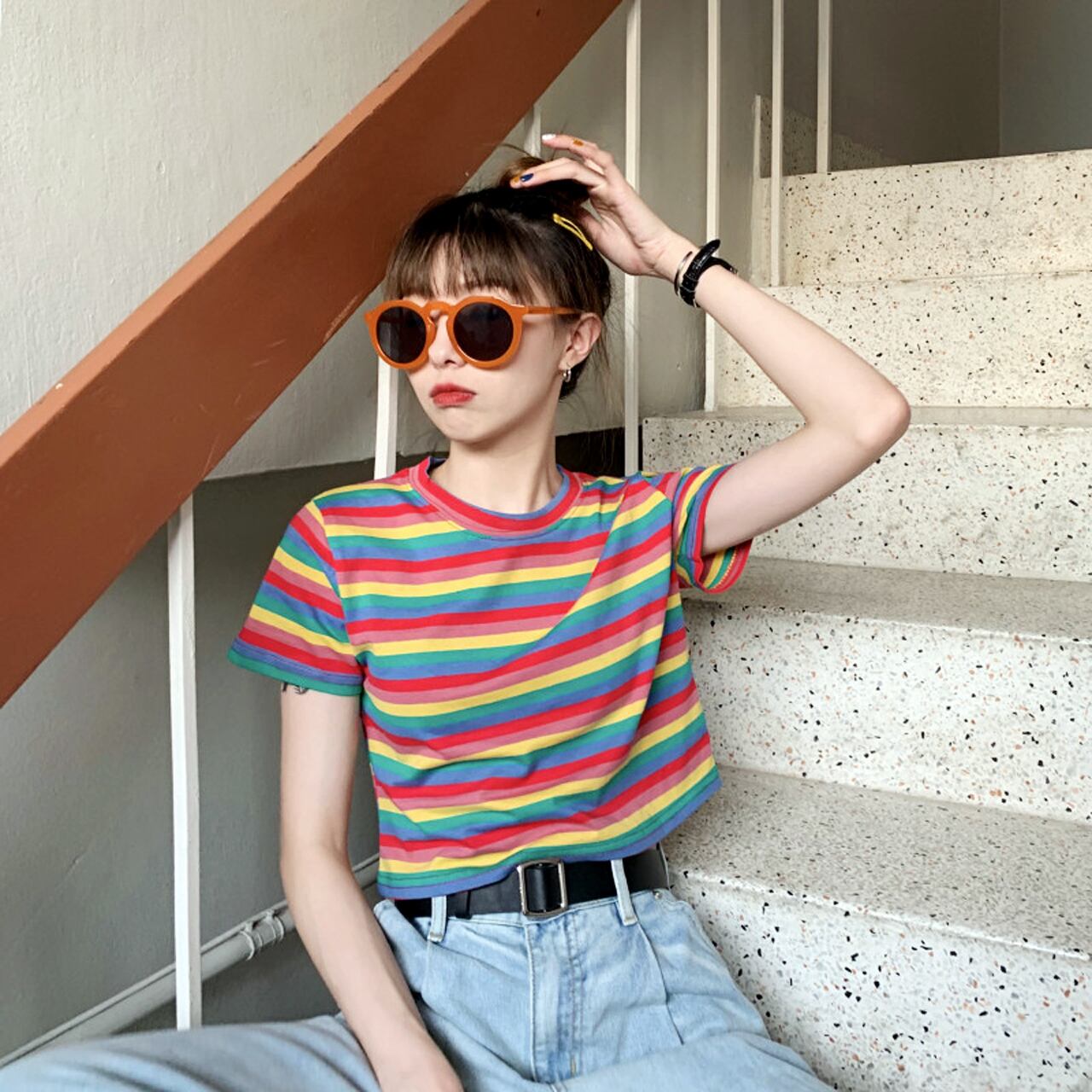 【REGIT】RAINBOW CROPPED T-SHIRT S/S 韓国服 トップス クロップド 半袖 Tシャツ 個性的 ストリート系 レインボー ボーダー 10代 20代 プチプラ 着回し 着映え ネット通販 TPT065