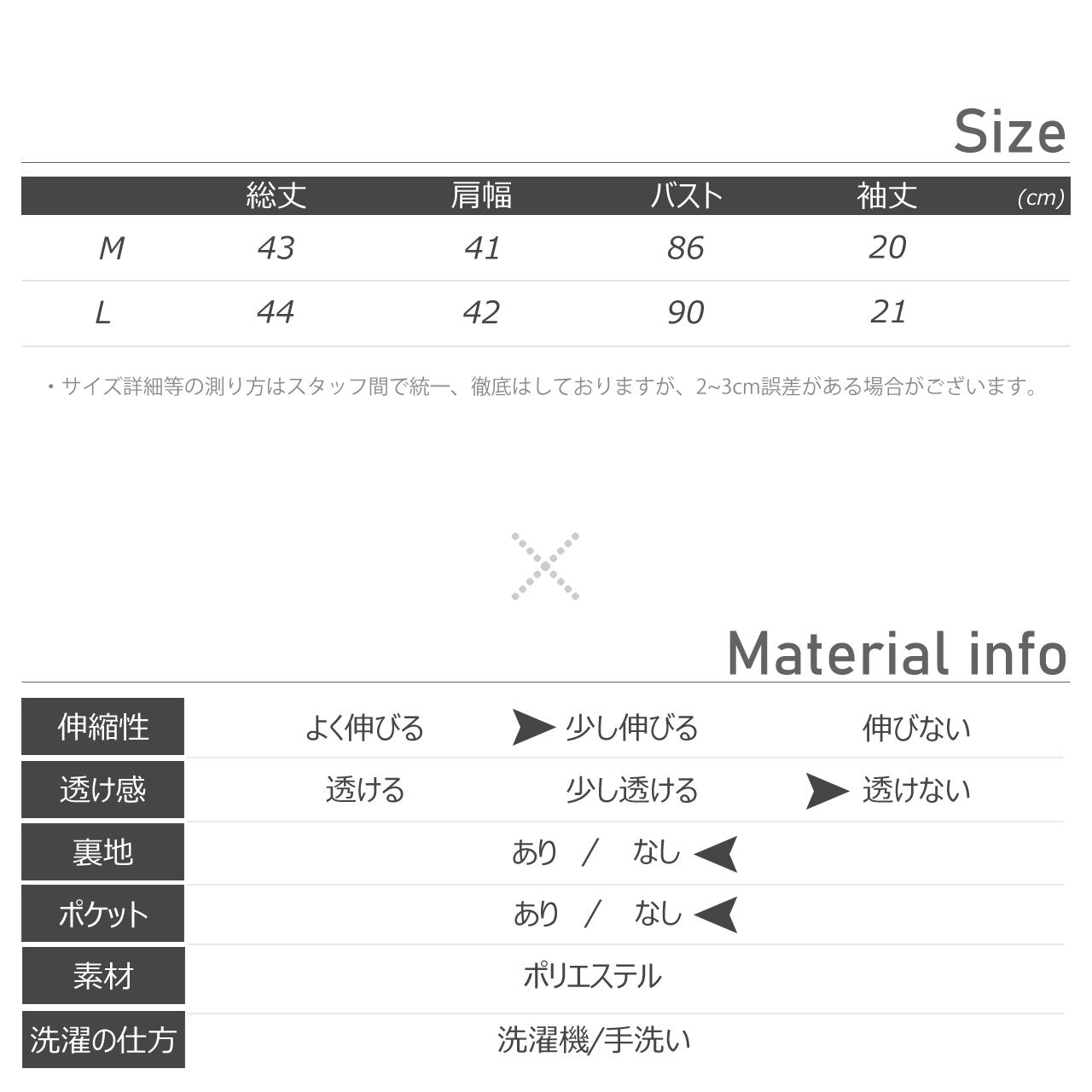 L-総丈:44/肩幅:42/バスト:90/袖丈:21 (cm)