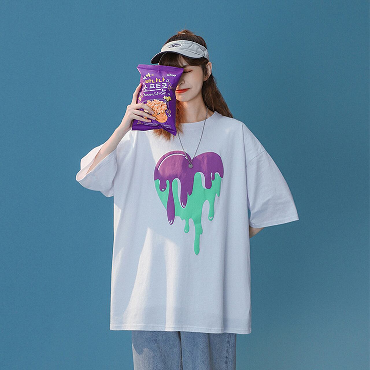 【REGIT】MELTING HEART HALF T-SHIRT-WHITE S/S 韓国服 ユニセックス ストリート系 トップス 半袖 Tシャツ カットソー オーバーサイズ 個性的 10代 20代 プチプラ 着回し 着映え ネット通販 TPT067