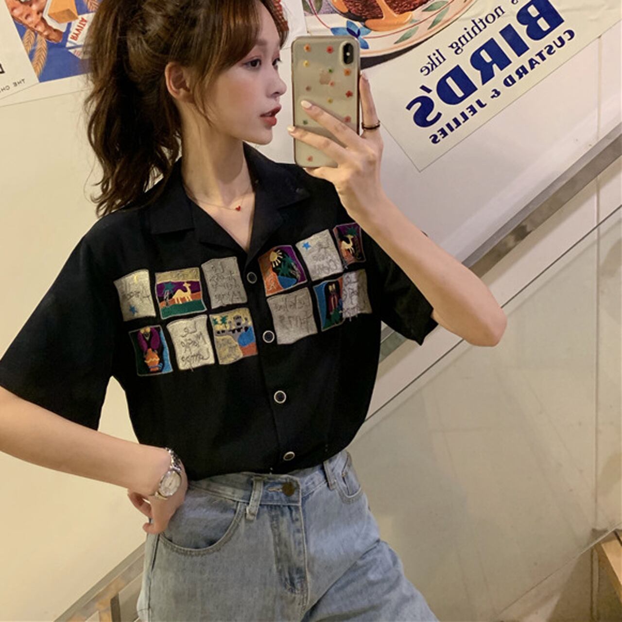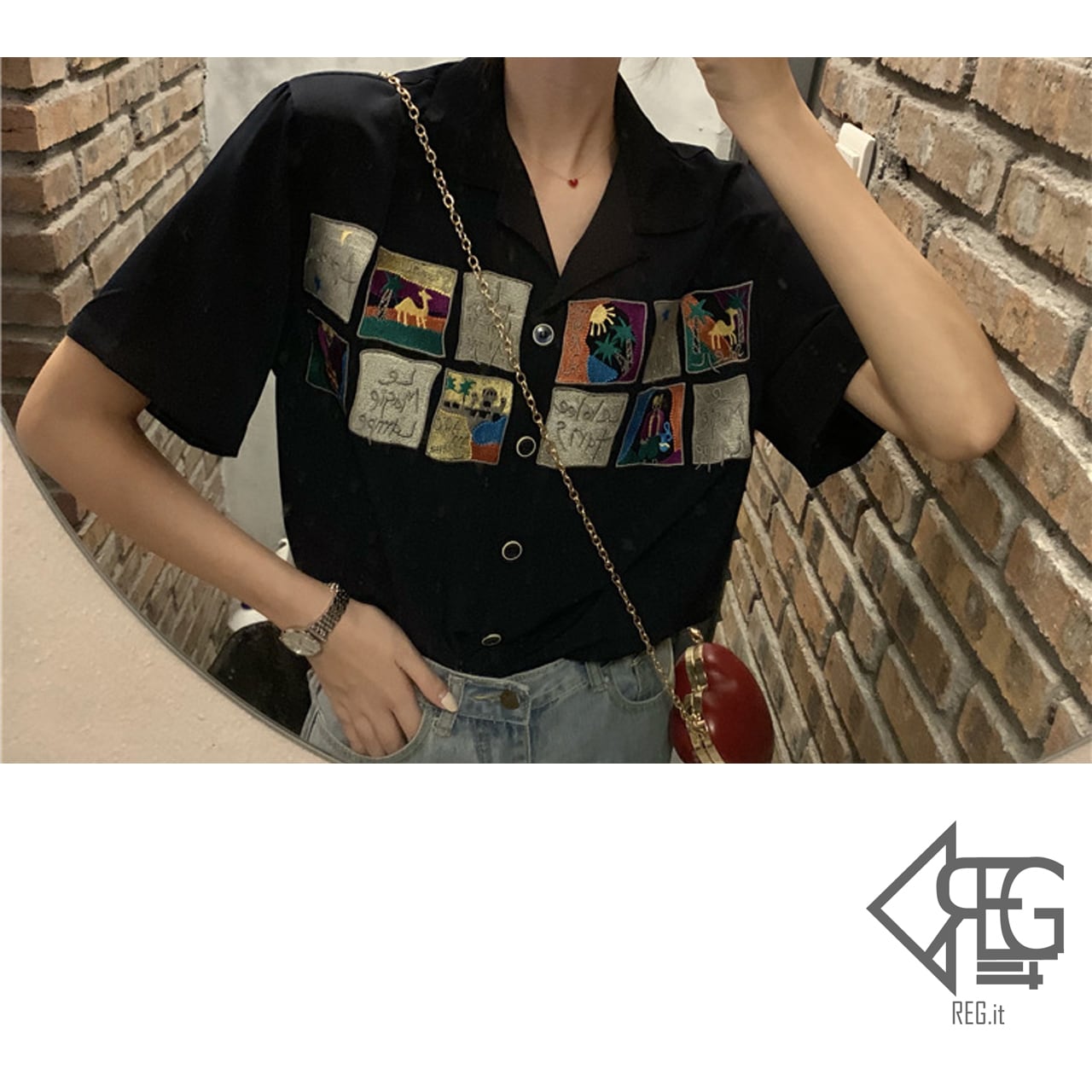【REGIT】【即納】CAMEL V NECK HALF SHIRT 韓国服 トップス シャツ ブラウス 半袖 夏 刺繍 ラクダ メンズライク 10代 20代 プチプラ 着回し 着映え カジュアル ネット通販 S/S
