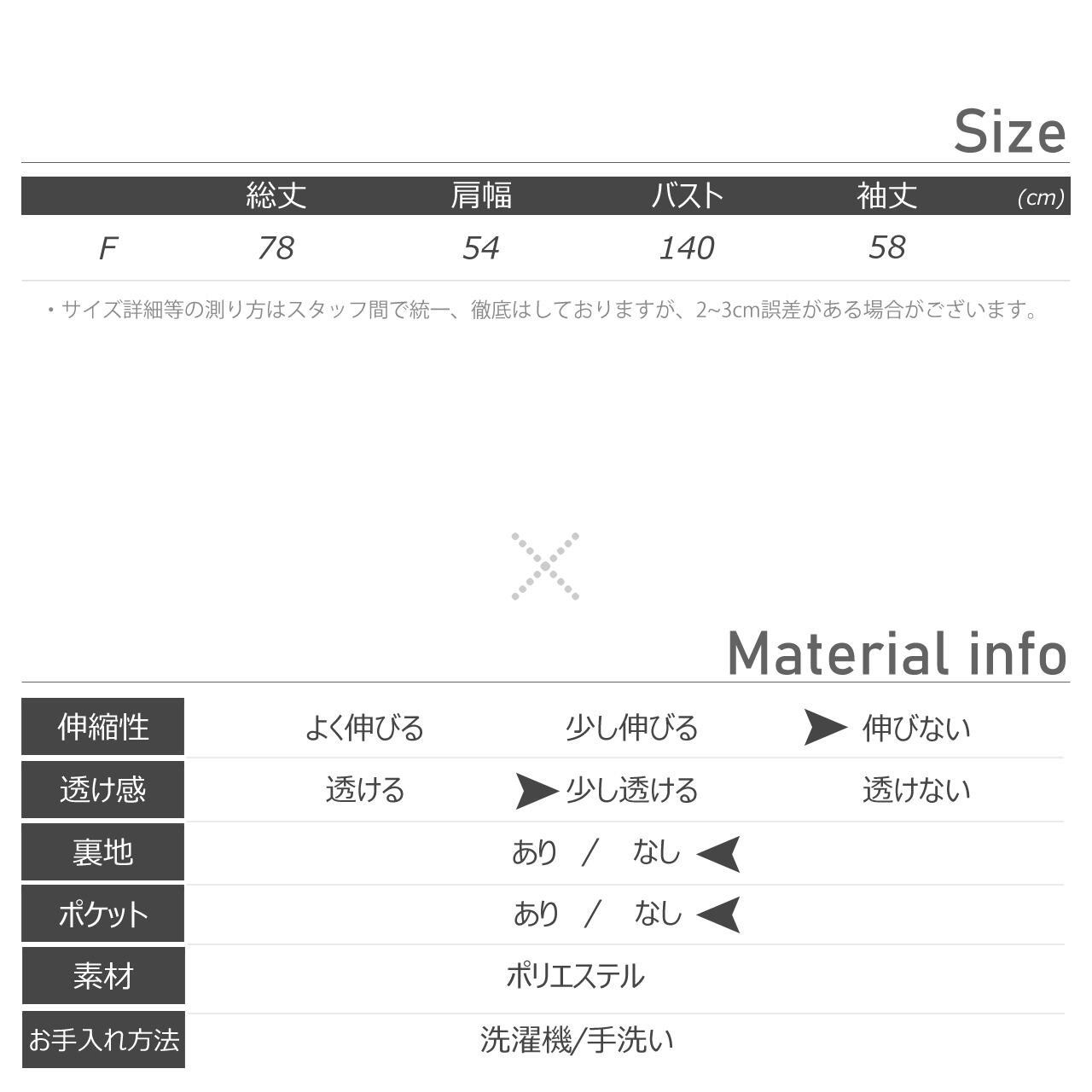 総丈:78/肩幅:54/バスト:140/袖丈:58 (cm)