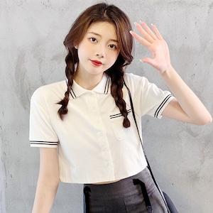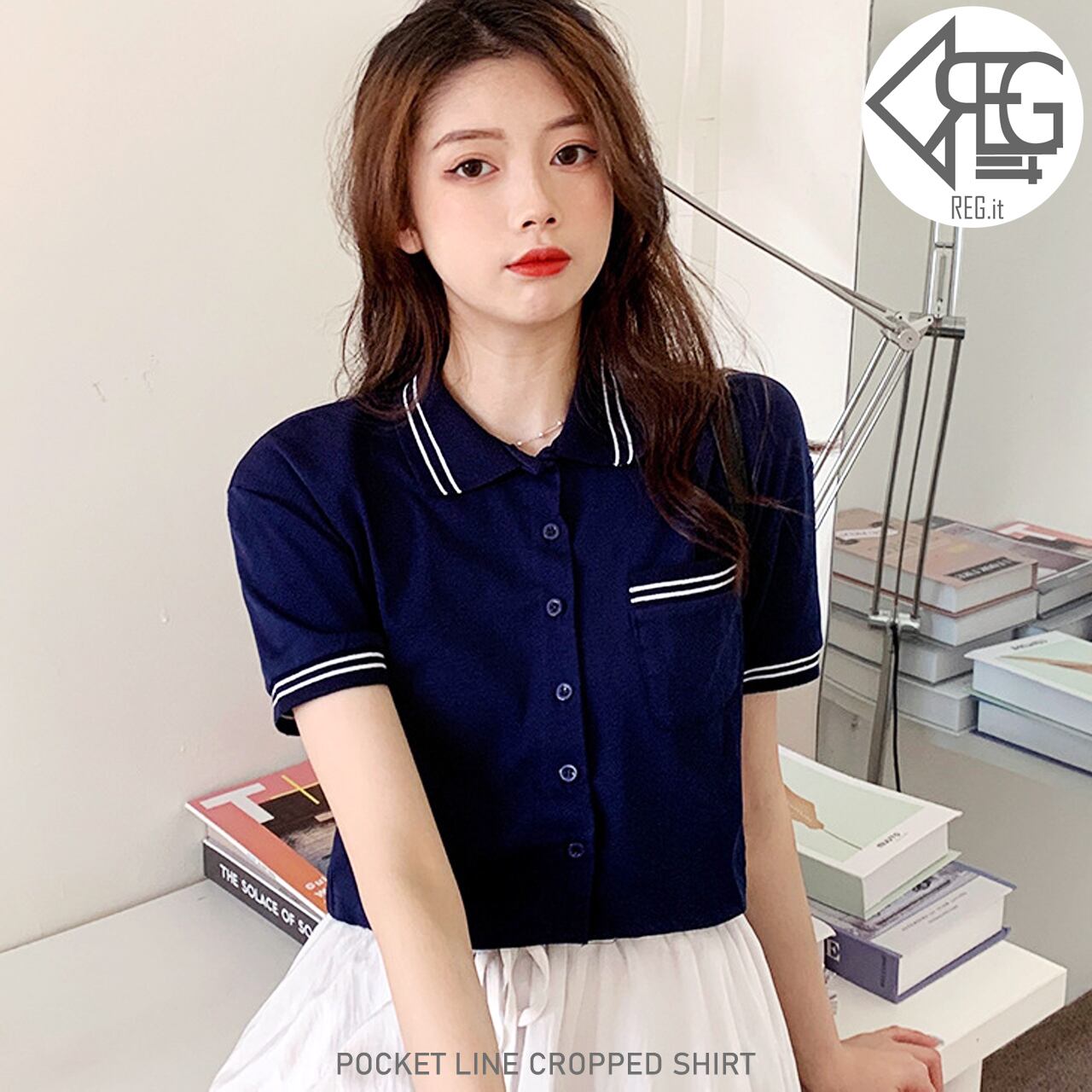 【REGIT】POCKET LINE CROPPED SHIRT-WHITE S/S 韓国ファッション トップス 半袖 シャツ ブラウス クロップド 10代 20代 プチプラ 着回し 着映え ネット通販 TPB037